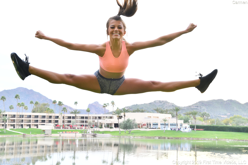 On the second day of this erotic teen's sexual adventure, we see Carmen in sporty clothes, doing all sorts of acrobatics in the park, cartwheels and backflips with serious skill! On the morning we see her wake up in a cute pink nightie, then masturbate again, using her two favorite toys to fuck herself and get wet. We get extreme closeups of her private parts, with her stretching her labia, then gaping her vagina really wide!