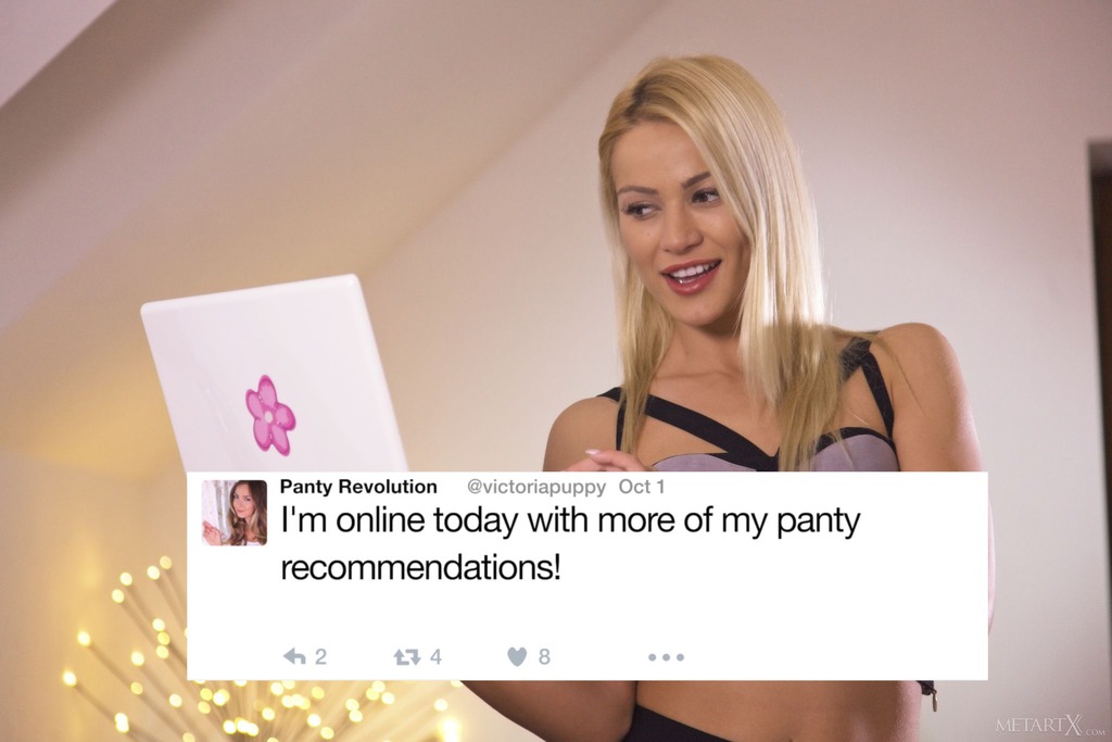 Sexy blonde Cherry Kiss has a thing about panties, and gets so turned on watching Victoria Puppy's hot panty blog. She's wearing naughty open-crotched panties herself, as she reveals when she pulls up her tight skirt to stroke her moistening pussy. She squeezes her beautiful breasts and fingers her juicy slit, then uses her favorite dildo to fuck herself to orgasm.