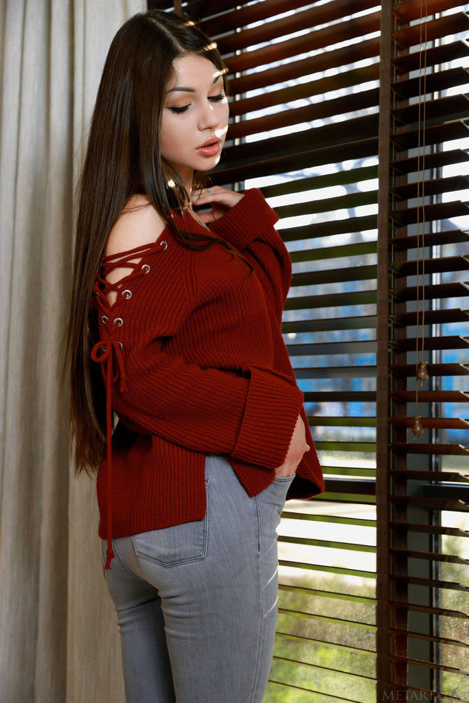 Cozy and warm in her luxurious wool sweater and figure-hugging denim pants, dark-eyed beauty Delphina smiles sweetly. Half-closing the blinds in front of the full-length windows, she turns around and lets you feel the full force of her seductive gaze. Her fingers trace a line down the nape of her neck to the top of her sweater, pulling it down until she has exposed her breasts, round and voluptuous with pale nipples pointing skywards. They stiffen beneath her fingers, jutting out deliciously. She peels her tight denims down off her hips, her creamy ass on show, grabbing a cheek with each hand and giving them a squeeze. With her legs parted, she pulls her cheeks open, revealing everything she has to offer. Her shaved pussy parts, lips opening, exposing the hot pink inside, a succulent treat.
