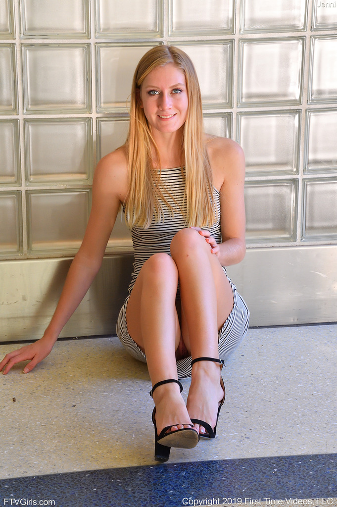 Later in the evening, Jenni puts on a very sexy form fitting dress and heels, gives us upskirt teasers and seethrough views, going home once again to use her new favorite vibrator to another strong orgasm. What a teen cutie, she's as innocent and new as you can get when it comes to adult… oh and not a single tattoo on her